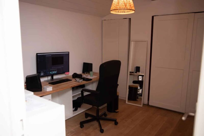À l’étage, un espace nuit fonctionnel propose un bureau, des rangements et une salle d’eau moderne.