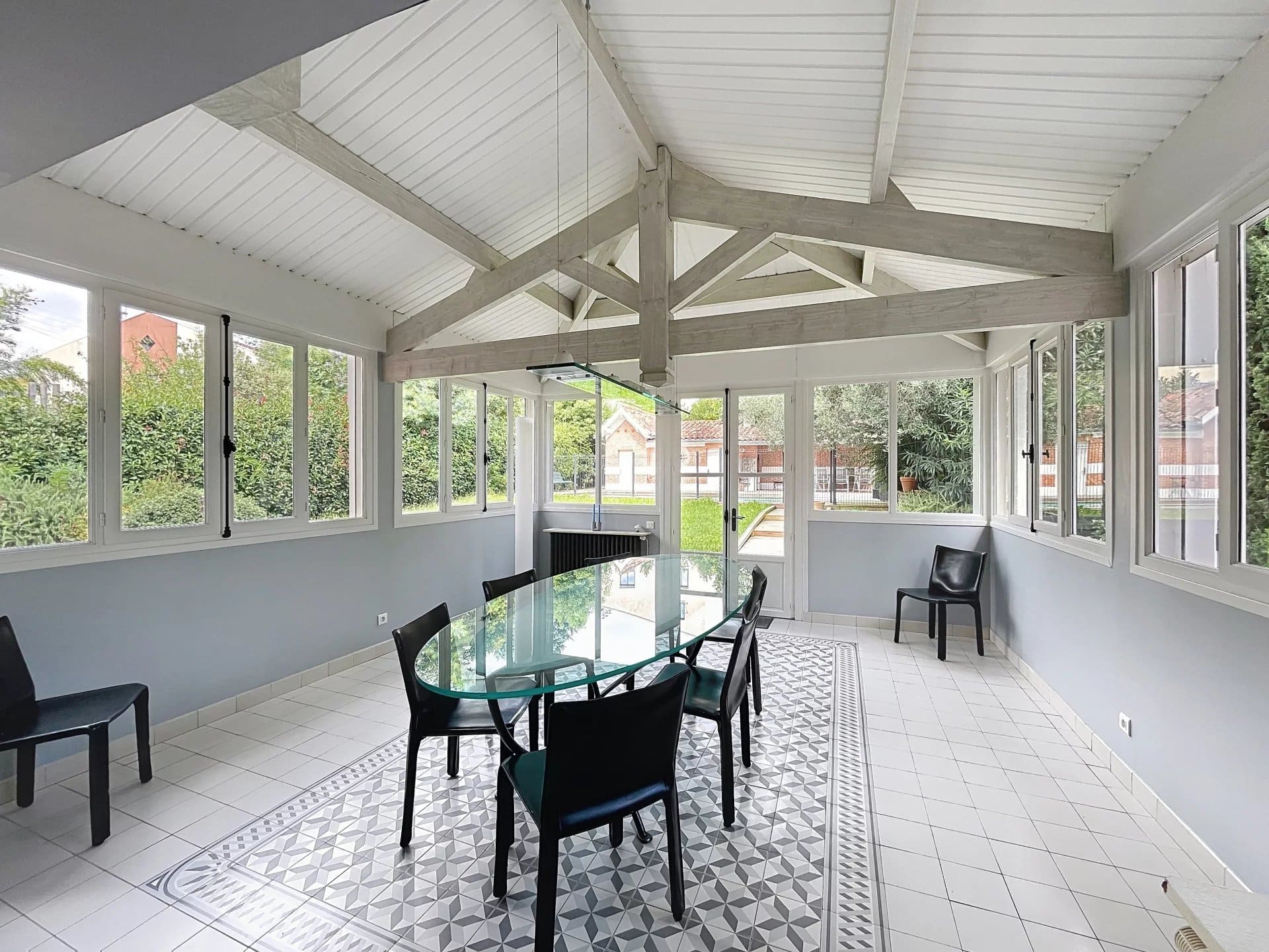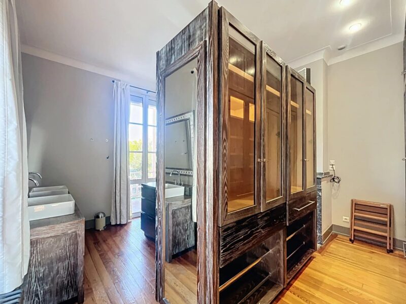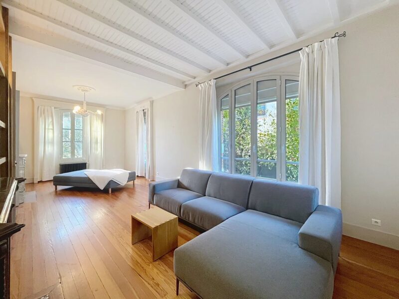 La maison, répartie sur deux niveaux avec un sous-sol semi-enterré, propose des espaces de vie lumineux et raffinés. Dès l’entrée, un salon traversant baigné de lumière, avec parquet et deux cheminées d’époque, invite à la détente. La cuisine, entièrement équipée avec des prestations haut de gamme (cuisson La Cornue, réfrigérateur, micro-ondes, machine à laver et nombreux rangements), s’ouvre sur une élégante salle à manger installée dans une verrière offrant une magnifique vue sur le jardin. Un bureau sur mesure complète ce niveau, accessible depuis le hall d’entrée.