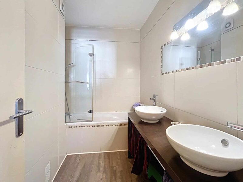 L’entrée dessert trois chambres dont une grande avec rangements intégrés. Une salle de bain avec double vasque, des toilettes séparées et une buanderie indépendante.
